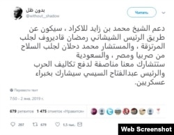 "Поддержка курдов со стороны шейха Мухаммада бен Зайда (наследного принца Абу-Даби и заместителя Верховного главнокомандующего Вооруженными силами ОАЭ – ред.) будет осуществляться через Рамзана Кадырова – для привлечения наемников, через Мухаммада Дахляна (палестинского политика из партии ФАТХ – ред.) – для привлечения оружия из Сербии и Египта; Саудовская Аравия разделит с нами (с Эмиратами – ред.) поровну затраты на войну, а президент [Египта] Абдель-Фаттах ас-Сиси предоставит военных советников", - написал 2 января аккаунт под ником "Без тени". У его страницы около 200 тысяч подписчиков.