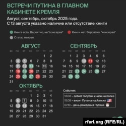 Что Путин делал в дни публикаций "консерв"? В основном созванивался с коллегами из других стран: 18 августа – с президентами Таджикистана, Кыргызстана, Бразилии и премьер-министром Индии. Кроме того, поздно вечером по Москве в этот день, прервав встречу с Зеленским и европейскими лидерами, Путину звонил Дональд Трамп. Через два дня Путин звонил президенту Турции, а 25 августа – президенту Ирана.